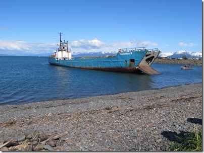This morning we left Ninilchik and drove up the steep hill we had descended yesterday. Dennis was ahead of us and got on the CB to let us know a wide-load boat was being towed down the narrow road, so we might want to wait. I did so, and when it had cleared the path, I spotted another one coming down so I waited longer. When the path looked clear, I started up, hoping I didn’t encounter another big rig. A boat did come down as we were on our way up, but it wasn’t a wide load so we had no problem.